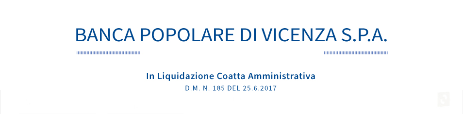 Si comunica che, con Decreto n. 185 del 25 giugno 2017, il Ministero dell'Economia e delle Finanze (MEF) ha disposto, su proposta della Banca d'Italia, la sottoposizione di Banca Popolare di Vicenza S.p.A. a liquidazione coatta amministrativa, ai sensi dell'articolo 80, comma 1, del Testo Unico delle Leggi in materia bancaria e creditizia – TUB e dell'art. 2 comma 1, lettera a), del Decreto Legge n. 99 del 25 giugno 2017 (convertito nella Legge 121/2017). Con provvedimento della Banca d'Italia del 25 giugno 2017, sono stati nominati Commissari Liquidatori: • Prof. Avv. Giustino Di Cecco • Dott. Claudio Ferrario • Dott. Fabrizio Viola (mandato concluso il 17 aprile 2018) Con provvedimento della Banca d'Italia del 17 aprile 2018 è stato nominato Commissario Liquidatore il Dott. Francesco Schiavone Panni, in sostituzione del dott. Fabrizio Viola (cfr. "Comunicazione dei Commissari Liquidatori" del 20 aprile 2018). Con provvedimento della Banca d'Italia del 25 giugno 2017, sono stati nominati componenti del Comitato di Sorveglianza l'Avv. Maria Elisabetta Contino, il Prof. Avv. Francesco De Santis e il Prof. Avv. Raffaele Lener. Il Comitato di Sorveglianza, nella riunione tenutasi il 25 giugno 2017, ha nominato Presidente del Comitato stesso il Prof. Avv. Raffaele Lener. Per quanto attiene la decorrenza dei termini di cui all'art. 86 TUB, si rimanda alla "Comunicazione dei Commissari Liquidatori" del 22 febbraio 2018, disponibile nella presente Sezione del sito. Si precisa, altresì, che l'indirizzo PEC della procedura è il seguente: lcabancapopolaredivicenza@pecliquidazioni.it. |